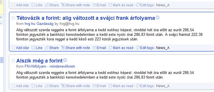 Én meglehetősen sok újság feed-jére iratkoztam fel, legalábbis újságcikk-címek szintjén. Azaz naponta kétszer átsöprök a címeken, az érdekesebbeket (napi 2-3) meg is nyitom olvasásra. Ez a technika egy meglehetősen érdekes médiaképet eredményez. Az egy dolog, hogy így minden hír harsány formában jut el hozzám. Az egy másik, hogy egyből látszik, mit hype-ol a sajtó. Valaki ír róla, aztán egy órán belül az összes másik újság is. (Ebből egész érdekes dolgok szoktak születni. Teszem azt, az egyik megírja, hogy Böhönyén szőrös tök nőtt a dinnyeföldön. Rá félórára szinte az összes újság lehozza a böhönyei szőrös tököt, mintha mindenkinek lett volna egy böhönyei tudósítója, aki éppen a dinnyeföldet leste az adott időpontban.)